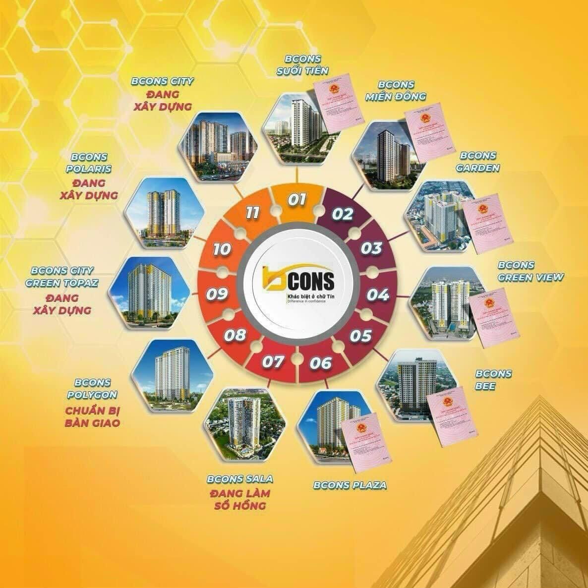 Chủ Đầu tư Bcons đã đem đến 12 dự án căn hộ trong đó có 7/7 dự án đã ban giao nhà và sổ hồng cho Khách Hàng.