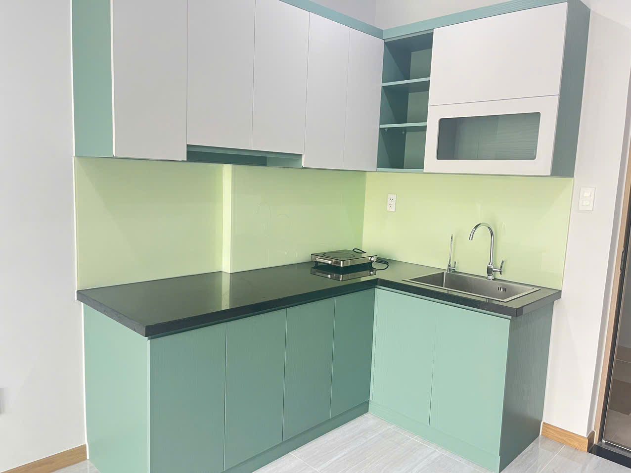 Nội thất cơ bản gồm tủ bếp, bếp hồng ngoại, kính bếp, rèm và dàn phơi