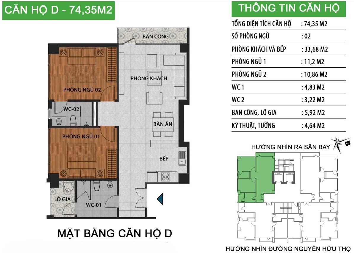 Thiết kế : 2 phòng ngủ, 1 phòng khách, 1 phòng bếp, 2 wc