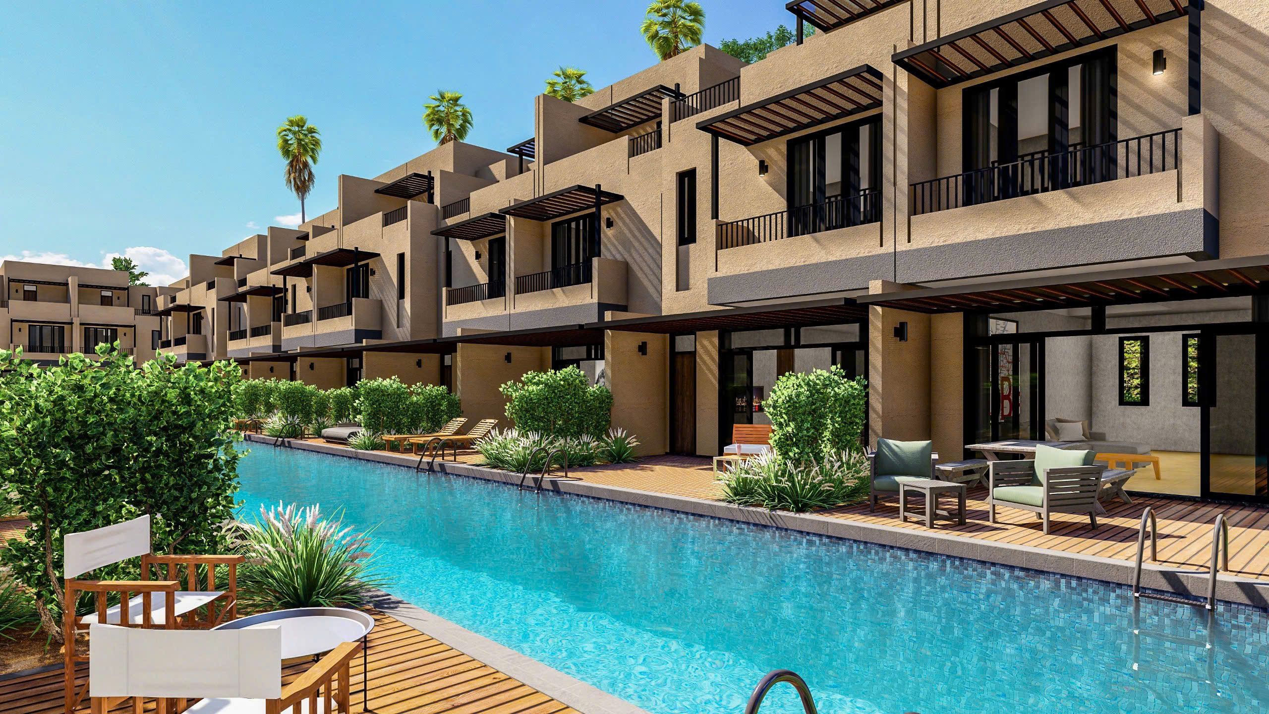 Thiết kế: 100% nhà đều có hồ bơi riêng biệt và bãi đỗ xe trong nhà.